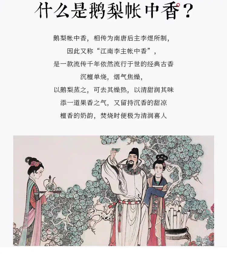 According to historical records, this incense was deeply loved by the literati and nobles, and people often burned incense in the gauze tents to help sleep, and the goose pear tent incense with a fruity fragrance is one of the most famous kinds.